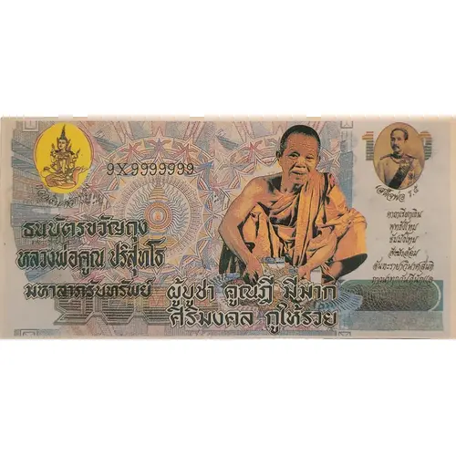 Описание оборотной стороны An image of Rama IX with a monk, 8 small images of sculptures of seated monks. Beneath the image of a gate, the Thai inscription reads: Pratu Chumphor, referring to the Chumphor Gate in Nakhon Ratchasima (Korat). The origin of this amulet can be traced back to Korat, as the depiction of the female figure on the back shows Thao Suranari, a local heroine of Korat. Why does the year 1996 suddenly appear on the 500 and 1000 Baht banknotes? At first, I suspected it was related to the Golden Jubilee of Rama IX (who is also depicted on all three banknotes), but I`ve now found another explanation. I quote Wikipedia: `Laotian historians have long questioned the historical accuracy of the portrayal of Thao Suranari`s role prevalent in Thailand. However, in 1995, Saipin Kaewngamprasert, a Thai history student at Thammasat University, wrote her master`s thesis entitled `The Images of Thao Suranari in Thai History` (later published as a book titled `The Politics of the Thao Suranari Monument`). In it, she critically examined the heroization of the figure. According to her account, the nationalist ideologues of the 1930s transformed a mere local heroine into a national cult figure.` The historically insignificant figure was chosen and glorified for political reasons. According to Saipin, the political exigencies following the People`s Party`s rise to power and the suppression of the royalist Boworadet Rebellion in October 1934 shaped the historical portrayal of Thao Suranari`s role in suppressing Jao ​​Anouvong`s Laotian uprising of 1826. The political calculation behind the erection of the monument and the promotion of the Suranari cult was to secure the loyalty of the people of Korat. Thai nationalists and Korat residents who revered Thao Suranari reacted angrily. Many were misinformed and believed that Saipin had claimed Thao Suranari had never existed. In March 1996, a protest march of 50,000 people took place in Korat. Ultimately, the book was banned in Thailand. The text above the year 2539 reads: Hurrah! Hurrah! Hurrah! YA MO goes to war, a spell to defeat the enemy and the demons Thao Suranari Grandmother Mo 2539