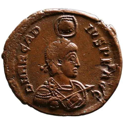 Bust of Arcadius, pearl-diademed, draped and cuirassed, right, holding spear and shield in front; above, hand holding wreath. |