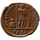 Emperor, head left, standing facing, holding standard in right hand and resting left on shield; to left, captive seated left, head turned right. |