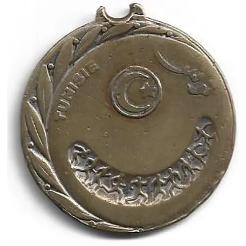 Obverse description The right side of the medal is decorated with olive leaves. At the top, a circle containing a crescent and a star (Tunisian flag) with the word Tunisia in French and Arabic on either side. Below, 10 athletes running.