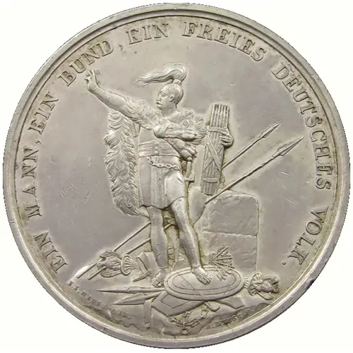Descrizione del dritto A armed Germanic warrior with the symbol of the bundle of rods in his arms at the basis of the German Confederation, the wars of liberation from 1813/15 against Napoleonic France. At that time, the German states, led by Prussia and Austria, in alliance with Russia and Great Britain had driven the French emperor away from German soil and forced them to abdicate in two campaigns in France. The German consequently stands triumphantly on arms and field signs with the imperial eagle of Napoleon
