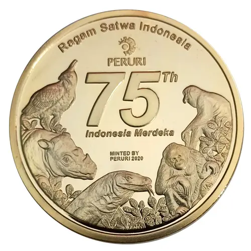 | Chữ khắc mặt trước | RAGAM SATWA INDONESIA PERURI 75TH INDONESIA MERDEKA MINTED BY PERURI 2020 (Javan Hawk-eagle, Javan Rhinoceros, Komodo Dragon, Orang Utan, Proboscis monkey) (Translation: Diversity of Indonesian wildlife PERURI (The Public Company for Money Printing of the Republic of Indonesia) 75 years Independence of Indonesia Minted by PERURI 2020) |