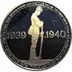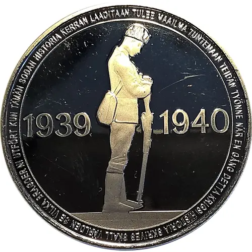 A standing lonely Finnish soldier in deep sorrow; the year of the outbreak of the Winter War is on the left, the year of its end is on the right. Lettering surrounding. |