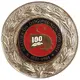 Opis awersu Flag with `100` and Atatürk`s silhouette facing right, Star and crescent ☪, Olive branches.