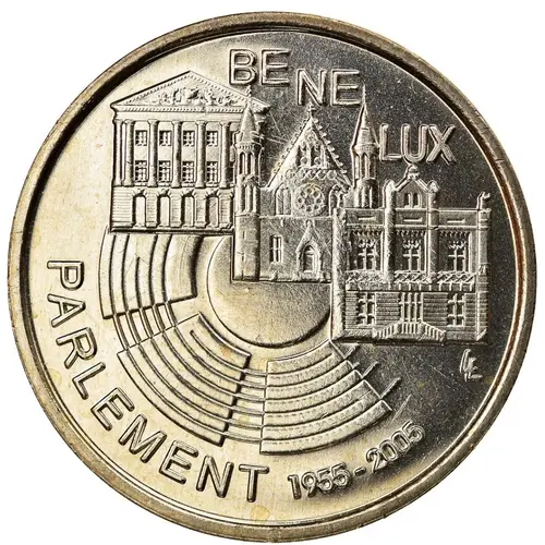 | Obverse lettering | BE NE LUX PARLEMENT 1955- 2005 LL |