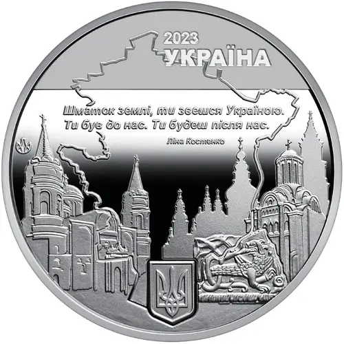 | Obverse description | Above is the legend 2023/УКРАЇНА; beneath is Ukraine’s small coat of arms; in the center, against the backdrop of a stylized map of the city, are the following lines from Lina Kostenko’s poetry: ШМАТОК ЗЕМЛІ, ТИ ЗВЕШСЯ УКРАЇНОЮ./ ТИ БУВ ДО НАС. ТИ БУДЕШ ПІСЛЯ НАС./ ЛІНА КОСТЕНКО; there is also a stylized composition made of historical and religious monuments; to the left is the mint mark of the NBU’s Banknote Printing and Minting Works. |