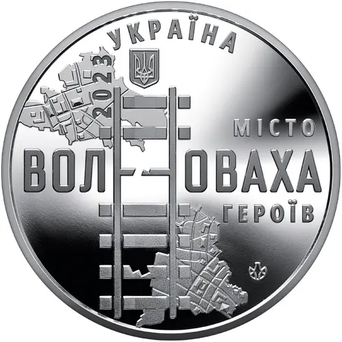| Description de l’avers | Above is the semicircular legend УКРАЇНА (Ukraine), under which are Ukraine’s small coat of arms and the medal’s issue year – 2023 (vertical, against the backdrop of a map); in the center, against a smooth background, is the legend МІСТО/ВОЛНОВАХА/ГЕРОЇВ (city/Volnovakha/heroes); in the word Volnovakha, the Ukrainian letter “н” is replaced with a fragment of railway tracks, which reach Ukraine’s small coat of arms and stands for the city’s desire to return home, to Ukraine; there are also stylized fragments of maps of Donetsk (above) and Mariupol (below); beneath, to the right is the mint mark of the NBU’s Banknote Printing and Minting Works. |