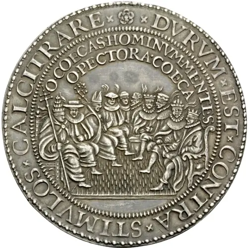| Mô tả mặt trước | Philipp II of Spain and Catholic heads of the Church and State, blindfolded and seated in discussion, their feet on a spiked floor. |