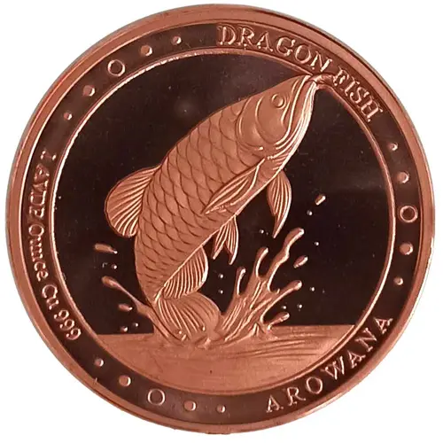 A Arowana, also known as the “Dragon Fish,” leaping gracefully out of the water with splashes surrounding it. The upper rim bears the inscription `DRAGON FISH`, while the lower rim reads `AROWANA`. On the left side, the specification `1 AVDP Ounce Cu .999` indicates the coin is struck from .999 fine copper and weighs one avoirdupois ounce (approximately 28.35 grams). The outer edge is adorned with a dotted border pattern, adding an elegant frame to the aquatic-themed design. |