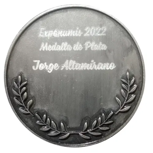 | Beschrijving voorzijde | Matte silver surface with white-printed inscription “Exponumis 2022 – Medalla de Plata – Jorge Altamirano”, laurel branches at bottom . |