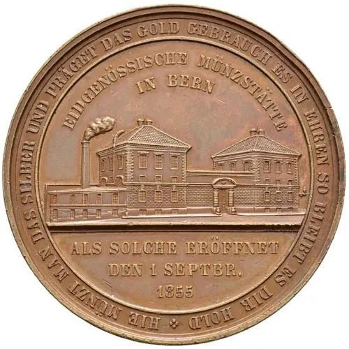 | 表面の銘文 | HIE MÜNZT MAN DAS SILBER UND PRÄGET DAS GOLD GEBRAUCH ES IN EHREN SO BLEIBT ES DIR HOLD EIDGENÖSSISCHE MÜNZSTÄTTE IN BERN ALS SOLCHE ERÖFFNET DEN 1 SEPTBR. 1855 |