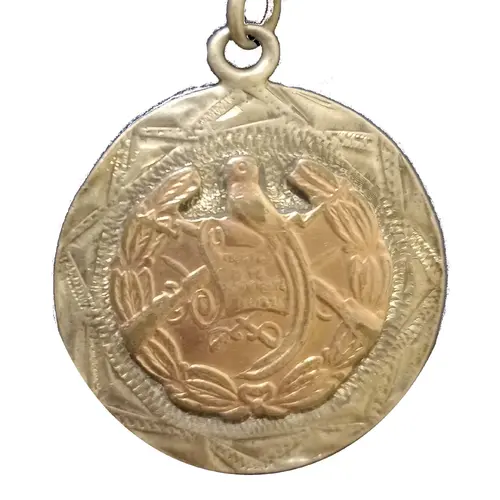 | Descripción del anverso | Embossed Guatemalan coat of arms with Quetzal, scroll, rifles, swords, and laurel wreath; gold-toned plating over silver base. |