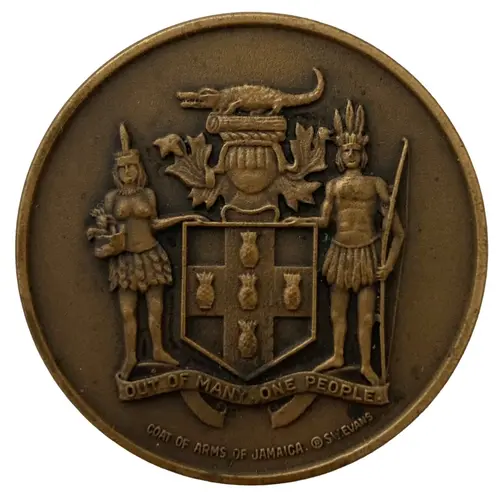 نوشته‌های روی مدال OUT OF MANY, ONE PEOPLE COAT OF ARMS JAMAICA. ® S.W. EVANS