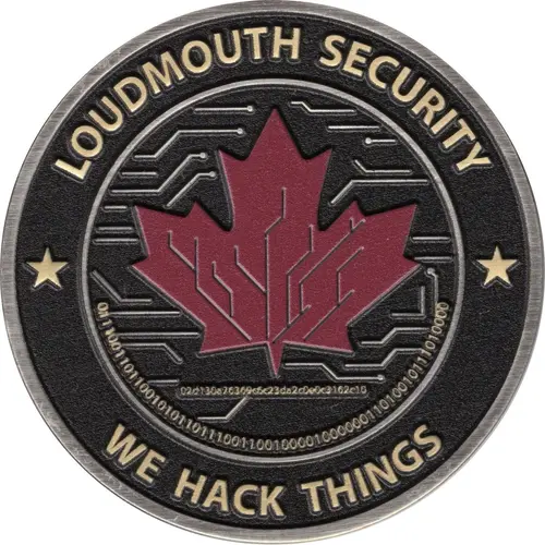 | 表面の銘文 | LOUDMOUTH SECURITY 02d130a76369c6c23da2c0e0c3162c10 01110011011001010110111001100100001000000110100101110100000 WE HACK THINGS |