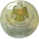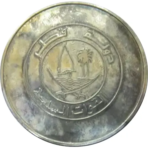 | توضیحات روی مدال | Emblem of Qatar consisting of two crossed bent swords, and between them a sailing ship (dhow) sailing on waves beside an island with two palm trees; within circle |