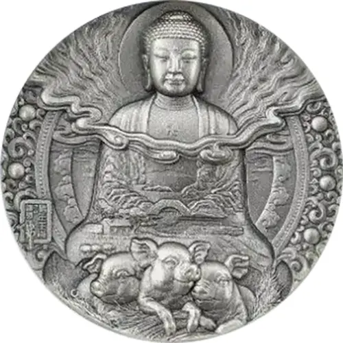 | Mô tả mặt trước | Sitting Buddha with three pigs at feet. Chinese lettering at right knee. |