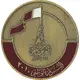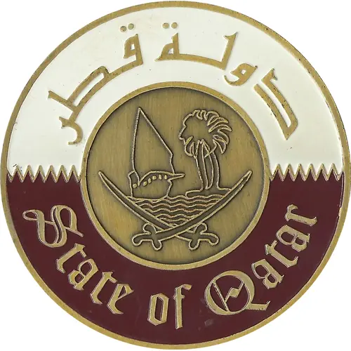 | 表面の説明 | Emblem of Qatar consisting of two crossed bent swords, and between them a sailing ship (dhow) sailing on waves beside an island with two palm trees. The circle is surrounded by a round colored doughnut-shaped object, which is divided horizontally representing the flag of Qatar. In the white section the name of the state of Qatar is written in Arabic, and in English in the maroon section |
