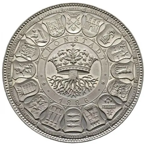 Opis awersu Coat of arms of Kronstadt (modern-day Brașov, Romania). 16 coats of arms arranged in a circle around: Hermannstadt (modern-day Sibiu, Romania), Klausenburg (modern-day Cluj-Napoca, Romania), Bistritz (modern-day Bistrița, Romania), Broos (modern-day Orăştie, Romania), Leschkirch (modern-day Nocrich, Romania), Mediasch (modern-day Mediaș, Romania), Sächsich-Regen (modern-day Reghin, Romania), Schässburg (modern-day Sighișoara, Romania), Fogarasch (modern-day Făgăraș, Romania), Reps (modern-day Rupea, Romania), Nagy-Enyed (modern-day Aiud, Romania), Grossschenk (modern-day Cincu, Romania), Mülbach (modern-day Sebeș, Romania), Reussmarkt (modern-day Miercurea Sibiului, Romania), Maros-Vásárhely (modern-day Târgu Mureș, Romania), and Karlsburg (modern-day Alba Iulia, Romania).