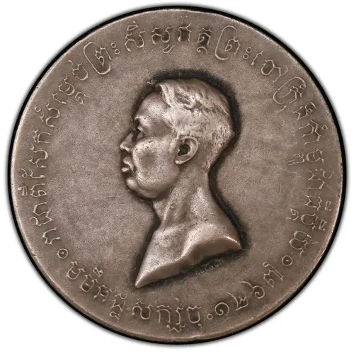 Description de l’avers Caption in Khmer. Nude bust of Sisowath I on the left, under the bust, signature: P.LENOIR.