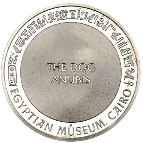 | Description du revers | Stylized depiction of Anubis shown as a recumbent jackal (bronze–gold tone), facing left. Smooth reflective background, wide raised rim. |