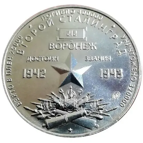 | Ön yüz lejandı | Воронеж Достоин Звания (1942-1943). Взято в плен 75000, Погибло 400000, Уничтожено 320000 (Translation: Voronezh Worthy of the Title (1942–1943). Captured 75000, Died 400000, Killed 320000) |