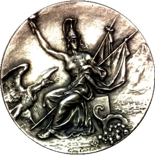 The coin shows Chile`s Crest on the left, depicting a shield of two colours with a five pointed star in the center and three feathered plumes at the top. On the right is Bolivia`s crest from the coat of arms, this shows an oval with an alpaca and a bundle of wheat before a tall mountain with the sun rising behind it. In the center is the Caduceus symbol of commerce with two olive branches below. The image is bordered with the inscription ` ● Peace treaty of friendship and trade ● 20 October 1904 ` |