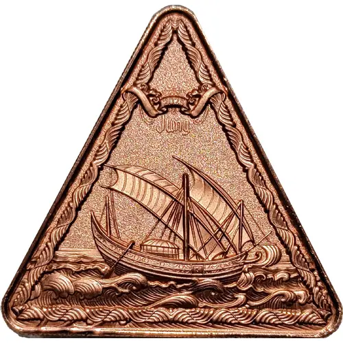 Descrizione del dritto This triangular-shaped medal is struck from pure copper weighing 1 AVDP oz and features the theme of traditional maritime heritage from the Indonesian archipelago. Features a detailed engraving of the Indonesian Jung ship with sails unfurled, gliding through stylized ocean waves. The intricate artistry captures the ship’s majestic masts and curved hull, symbolizing the rich seafaring legacy of the Nusantara. The border is framed with ornamental scrollwork.