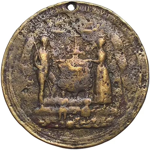 | Descripción del anverso | Male and female figures flanking arms, children at their feet |