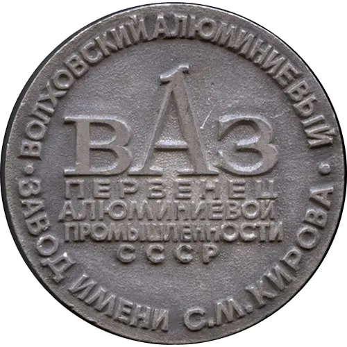 | Opschrift voorzijde | ВОЛХОВСКИЙ АЛЮМИНИЕВЫЙ ЗАВОД ВАЗ ПЕРВЕНЕЦ АЛЮМИНИЕВОЙ ПРОМЫШЛЕННОСТИ СССР • ЗАВОД ИМЕНИ С.М. КИРОВА • (Translation: Volkhov Aluminum Plant named after S.M. Kirov VAZ - the firstborn of the USSR aluminum industry) |