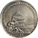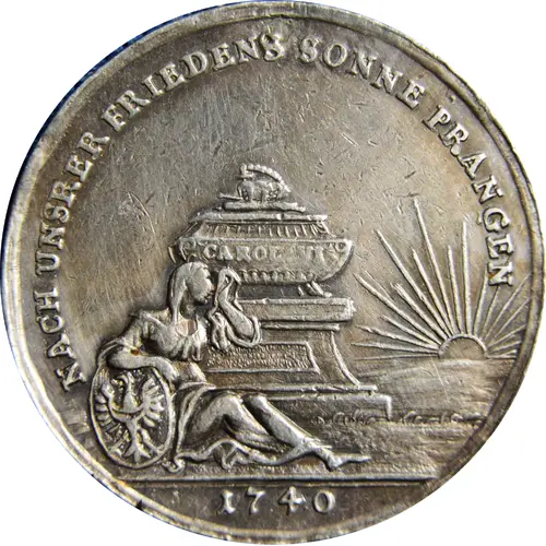 Woman in mourning, leaning on a shield representing the Prussian eagle, seated in front of the tomb of Charles VI, who died in 1740 of intoxication after eating amanites. In the background, a rising sun, with the legend above starting at 8 o`clock. The exergue shows the date of Charles VI`s death. |