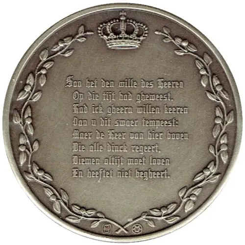 | Legenda do anverso | Soo het den wille des Heeren Op die tijt had gheweest. Had ick ghern willen keeren Van u dit swaer tempeest: Maer de Heer van hier boven Die alle dinck regeert. Diemen altijt moet loven En heeftet niet begheert. (Translation: Surely, if God had willed it, When that fierce tempest blew, My power would have stilled it, Or turned its blast from you But He who dwells in heaven, Whence all our blessings flow, For which aye praise be given, Did not desire it so.) |