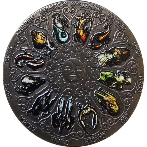 Надписи аверса Aries, Taurus, Gemini, Cancer, Leo, Virgo, Libra, Scorpio, Sagittarius, Capricorn, Aquarius, and Pisces