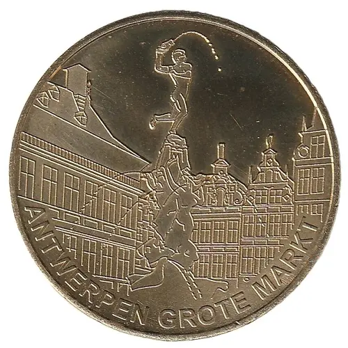 | Описание аверса | Left city hall Antwerp, Center Statue of Brabo (fountain), right old houses (corporations and gilds). |