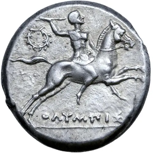 | Descripción del anverso | Warrior on horseback to right, brandishing spear in right hand and holding reins with left; wreath behind, ΟΛΥΜΠΙΣ below. |