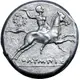 | Descripción del reverso | Taras astride dolphin to left, holding kantharos and cornucopiae; tripod to right, ΤΑΡΑΣ below. |