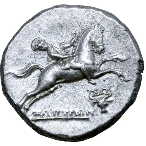 | Arka yüz açıklaması | Taras astride dolphin to left, holding hippocamp in extended right hand, trident against left arm; monogram and mask of Silenos right, ΤΑΡΑΣ below. |