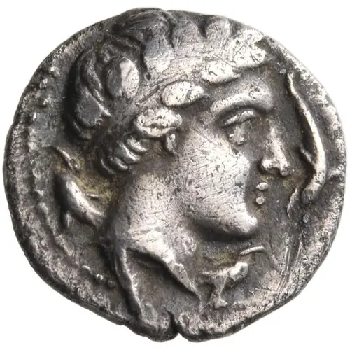| توضیحات روی سکه | Laureate head of Apollo right, three dolphins around. |