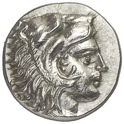 | Descripción del anverso | Herakles in lionskin headdress to right |