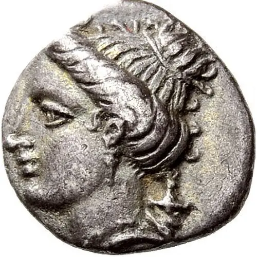 | Beschrijving voorzijde | Head of Artemis facing left, her hair tied in a knot at the top of her head, wearing a pendant earring, and with her quiver at her shoulder. |