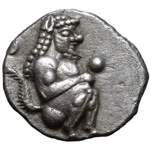 | توضیحات روی سکه | Satyr crouching right, two pellets flanking. |