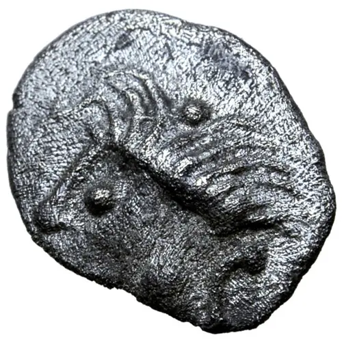 | Aversbeschreibung | Celticised male head left with pointed nose and large round eye; pellet in hair behind, torque below. |