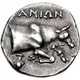 | Popis rubu | Forepart of ox right; krater to lower left, olive spray to lower right. |