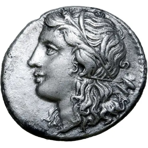 | Obverse description | Wreathed head of Persephone left, wearing wreath of grain leaves, hair loose at back; altar and A behind. |
