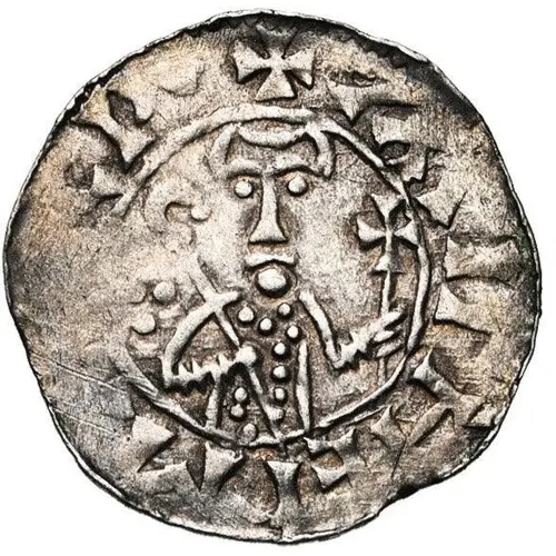 توضیحات روی سکه Half-length bust of bishop facing, holding crozier in right hand and cross-tipped staff in left. Three pellets in field to left.