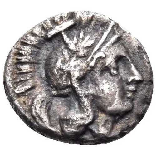 توضیحات روی سکه Head of Athena to right, wearing crested Attic helmet decorated with an olive wreath; between the helmet and the crest, large letter Τ.