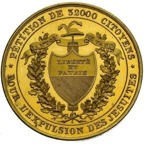 | Надписи аверса | ★ PÉTITION DE 32000 CITOYENS ★ POUR L’EXPULSION DES JESUITES CANTON DE VAUD LIBERTÉ ET PATRIE (Translation: Petition of 32000 citizens for the expulsion of the jesuits. Canton of vaud. Freedom and homeland.) |