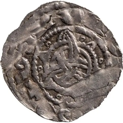 Mô tả mặt trước Lined ring and beaded circle with three applied points, traversed by a three-part loop; ring in the outer field. On the outside, a deceptive inscription between two beaded circles.