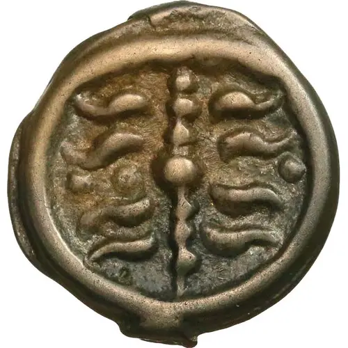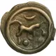 Stylized horse on the right, various ill-fitting ornaments (globules and crescents) between the legs, in front of the rump and above the back; peripheral ridge |