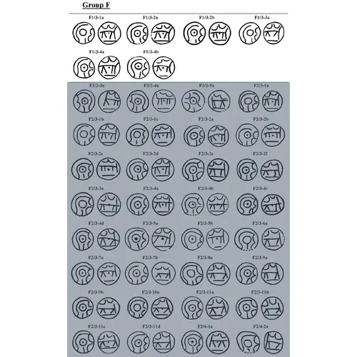 Descripción del reverso Outline bull left, slightly curved body, straight legs, crescent tail curving outwards, two crescents above. Exergual line below.