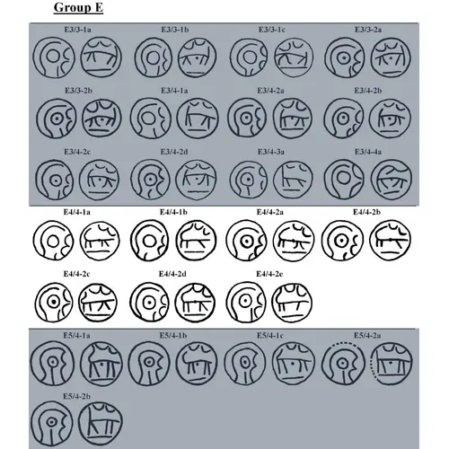 Outline head of Apollo right with line down centre of neck, eye ring with or without pellet, face and nose may be open. |